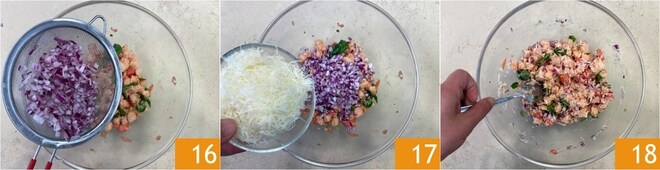 Pasado este tiempo, escurrid la cebolla y añadidla a la mezcla de pan 16. Añadid también una pizca de sal y el Pecorino rallado, reservando un poco para la superficie 17. Mezclad para amalgamar todo 18.