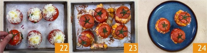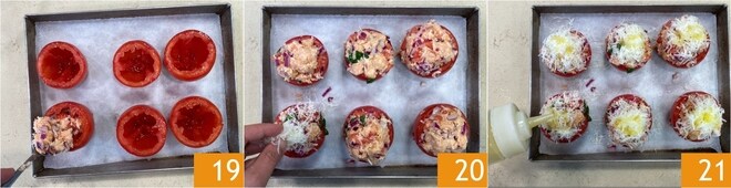 Recuperad los tomates vaciados y colocadlos en una bandeja forrada con papel de horno, luego rellenadlos con el relleno hasta formar una cúpula 19. Decorad la superficie con el Pecorino reservado 20 y un hilo de aceite 21.