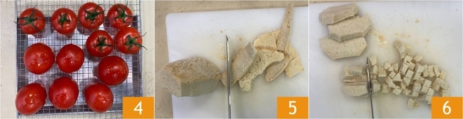 Colocad los tomates boca abajo en una rejilla 4 y dejadlos reposar para que pierdan el líquido en exceso. Mientras tanto, continuad con el resto de la receta: quitad la corteza del pan 5 y cortad la miga en cubos 6.