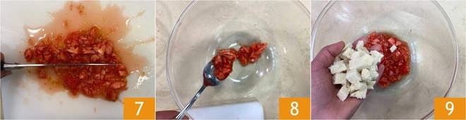 Picar groseramente la pulpa de los tomates 7 y transferirla a un bol 8, luego añadir la miga de pan 9.