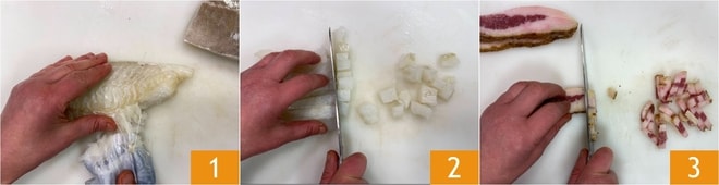 Para preparar los tonnarelli a la gricia con bacalao, primero quiten la piel del bacalao ya desalado 1 y cualquier espina, luego corten la pulpa en cubos 2. Eliminen la corteza del guanciale y córtenlo en tiras 3.