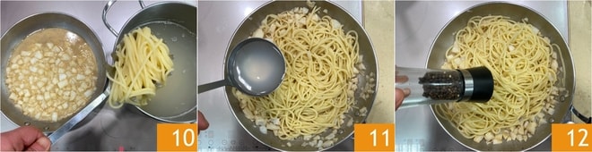 Escurran los tonnarelli en la sartén con el bacalao 10, añadan un cucharón de agua de cocción 11, pimienten 12 y mezclen todo a fuego vivo.