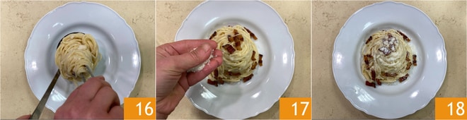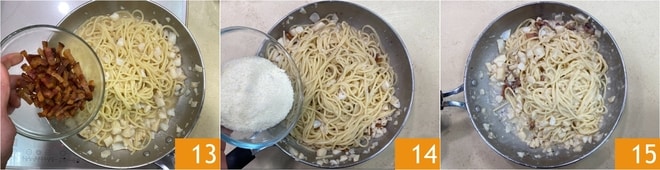 En este punto apaguen el fuego y añadan casi todo el guanciale crujiente 13 y casi todo el pecorino rallado 14. Añadan el queso poco a poco y mezclen bien el condimento hasta obtener una consistencia cremosa 15, vertiendo si es necesario aún un poco de agua de cocción.