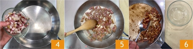 Coloquen el guanciale en una sartén bien caliente sin añadir grasas 4 y doren a fuego medio-alto, removiendo a menudo 5. Cuando el guanciale esté crujiente y dorado, transfieran a un bol dejando el fondo de cocción en la sartén 6.