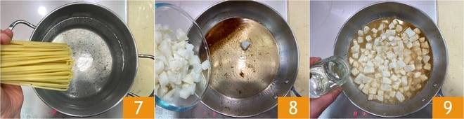 Mientras tanto, lleven a ebullición una olla con agua sin sal y cuezan los tonnarelli al dente 7. Mientras tanto, añadan el bacalao en la sartén donde cocinaron el guanciale 8 y salteen por un par de minutos, desglasando con el vino blanco 9.