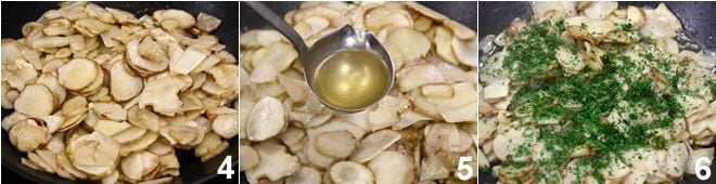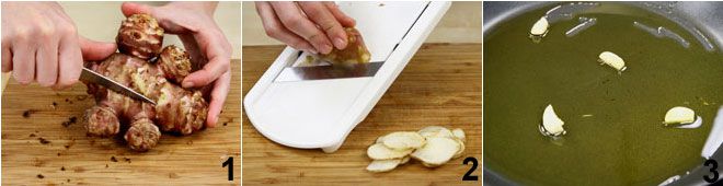Para cocinar los topinambur salteados, empezad con la limpieza de los tubérculos de topinambur. Primero frotad vuestras manos con zumo de limón, porque los topinambur, como las alcachofas, tienden a oscurecerse y a dejar los dedos manchados de negro. Preparad también un bol de agua acidulada (con zumo de limón) para sumergirlos una vez limpios. Con un cuchillo pequeño raspa la piel de los topinambur para eliminar la suciedad y las partes más duras 1. Lavadlos bien y sumergidlos en el agua acidulada para evitar que se oscurezcan. Escurrid y enjuagad los topinambur, cortadlos en rodajas finas de aproximadamente 2/3 mm, ayudándoos con un cuchillo afilado o con una mandolina 2 y preparad una sartén antiadherente donde calentaréis el aceite de oliva virgen extra y doraréis los dientes de ajo cortados en trozos 3.