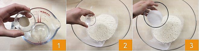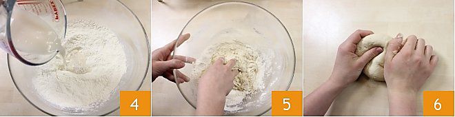 Añade la levadura disuelta en el agua 4 y amasa con las manos, primero recogiendo todos los ingredientes en el bol 5 y luego trabajando la masa sobre una superficie de trabajo 6,