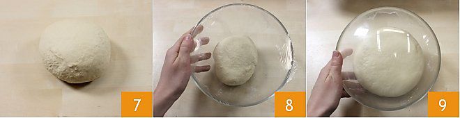 hasta obtener una bola lisa y homogénea 7. Deja que la masa fermente en un bol cubierto con film transparente durante una hora en un lugar sin corrientes de aire 8, hasta que haya duplicado su volumen 9.