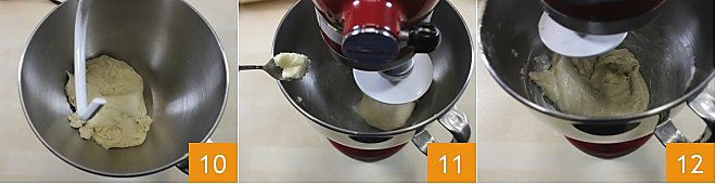 Pasado este tiempo, transfiere la masa al bol de una batidora de pie (si no tienes, puedes amasar a mano), equipada con un gancho 10 y añade la mantequilla ablandada a temperatura ambiente, un trozo a la vez 11, amasando a velocidad media 12.
