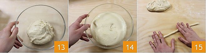 Cuando la mantequilla esté completamente absorbida, coloca nuevamente la masa en el bol 13 y déjala fermentar otra hora. Si la masa está muy pegajosa, añade un poco de harina o enharina las paredes del bol. Cuando haya duplicado su volumen 14, deja reposar la masa en el frigorífico al menos media hora antes de trabajarla, para que la mantequilla se solidifique. Enharina ligeramente una superficie de trabajo y divide la masa en pequeñas bolitas de aproximadamente 15 g cada una (serán unas 26), que modelarás en cilindros de medio cm de grosor y unos 15 cm de largo 15.