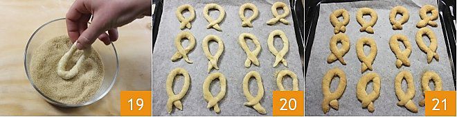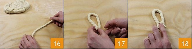 Retuerce el cilindro, enrollando las puntas y dándole la característica torsión 16 luego une los extremos 17, crúzalos y presiona ligeramente para fijarlos 18. Procede así hasta terminar la masa.