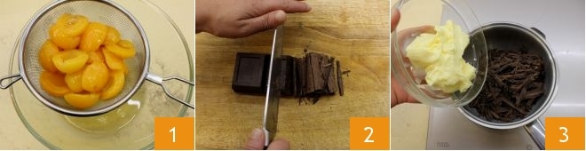 Para preparar la tarta de chocolate con albaricoques y amaretti, poned a escurrir los albaricoques del líquido de conservación 1. Luego picad el chocolate negro 2 y ponedlo en un cazo para derretirlo a fuego muy bajo junto con la mantequilla 3.
