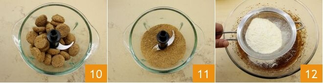 A continuación, apartad 12 amaretti y picad el resto para reducirlos a polvo (10-11); tamizad la harina en la mezcla 12 y mezclad con una espátula;