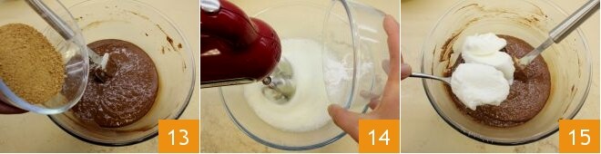 luego unid el polvo de amaretti y mezclad bien todo 13. Montad las claras a punto de nieve con el azúcar glas restante 14. Incorporad delicadamente las claras a la mezcla, mezclando de arriba hacia abajo para no desmontarlas 15.