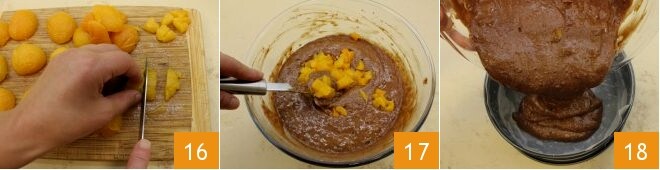 Finalmente, secad los albaricoques con un paño de cocina y cortadlos en pequeños cubos 16, dejando a un lado 8 enteros para la decoración. Agregad los albaricoques en trozos a la mezcla y mezclad 17; luego enharinad y forrad con papel de horno un molde de 23 cm de diámetro. Verted la mezcla dentro 18 y distribuidla con una espátula.