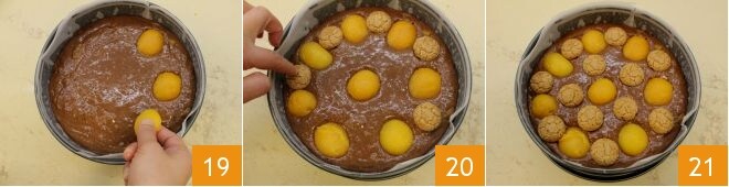 Luego colocad con cuidado los albaricoques en la superficie, con la parte cóncava hacia arriba 19. Podéis separarlos ligeramente y poner 7 en el borde y uno en el centro. Deberéis dejar espacio para los 12 amaretti que podréis alternar con los albaricoques 20. Una vez terminado 21, coced la tarta en horno estático precalentado a 180° durante 45 minutos (160° durante unos 35 minutos si es horno ventilado).