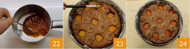 Mientras tanto, derretid a fuego muy bajo la mermelada de albaricoques 22: cuando la tarta esté lista, sacadla del horno y aún caliente pasad la mermelada sobre los albaricoques con un pincel 23. ¡La tarta de chocolate con albaricoques y amaretti está lista para ser servida 24!