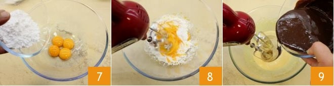 y montad las primeras con dos tercios del azúcar glas 7: podéis usar una batidora eléctrica 8 o una varilla manual. Luego verted el chocolate fundido tibio y seguid trabajando la mezcla 9.