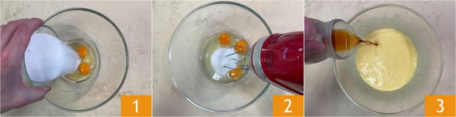 Para preparar la tarta de té sin lactosa, como primer paso, lleva a ebullición 200 g de agua y coloca las bolsitas de té en infusión. Toma 150 g de té y deja enfriar completamente. En un bol, coloca los huevos, el azúcar 1 y una pizca de sal, luego bate con las varillas eléctricas hasta obtener una mezcla homogénea 2. En este punto, añade el té ya frío 3.