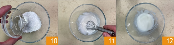 Mientras tanto, prepara el glaseado: en un bol, mezcla el azúcar glas y el agua 10, luego mezcla bien con una varilla 11 hasta obtener una mezcla homogénea 12.