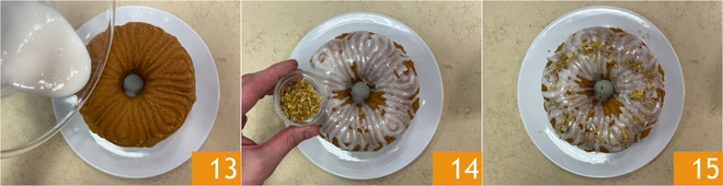 Verifica la cocción con un palillo, luego saca la tarta del horno y deja que se enfríe en el molde. Una vez fría, desmóldala en un plato de servir y cúbrela con el glaseado 13. Decora al gusto con flores comestibles 14 y sirve tu tarta de té sin lactosa 15!