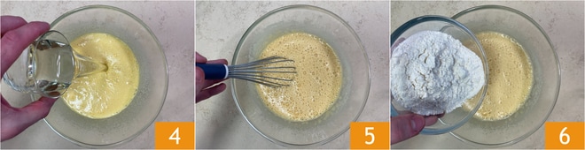 Vierte también el aceite de semillas 4 y mezcla rápidamente 5, luego añade la harina 6.