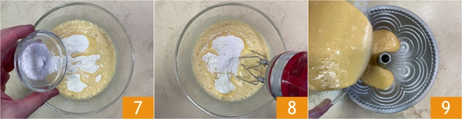 Añade la levadura para postres 7 y mezcla todo con las varillas 8. Transfiere la mezcla a un molde de rosquilla de 24 cm de diámetro 9, aceitado y enharinado, y hornea en horno estático a 180° durante 45-50 minutos.