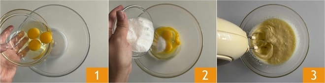 Para preparar la tarta de nata, comienza vertiendo los huevos enteros 1 y el azúcar en un bol grande 2. Luego trabaja con las batidoras eléctricas, hasta que los huevos resulten claros, hinchados y espumosos 3.