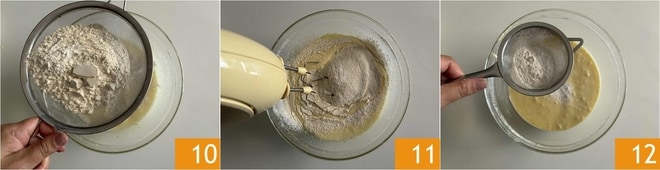 Ahora puedes incorporar la harina, cuidando de tamizarla con un colador 10. Después de haberla integrado bien 11, solo queda añadir la levadura, siempre tamizada 12.