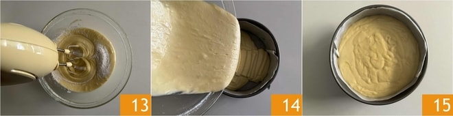 En este punto continúa mezclando con las batidoras eléctricas, hasta obtener una mezcla cremosa y homogénea 13. Vierte la mezcla en un molde desmontable de 18-20 cm forrado con papel de horno o engrasado y enharinado 14 15. Hornea en horno estático precalentado a 180° en la guía central durante unos 45 minutos. Los tiempos pueden variar según el horno, comprueba la cocción con un palillo.
