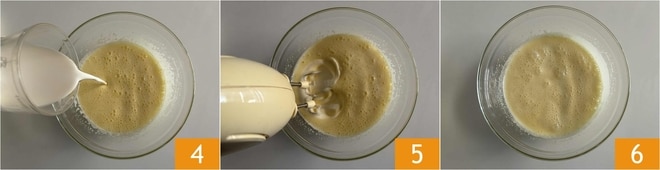 Posteriormente añade la nata fresca 4 y continúa trabajando con las batidoras eléctricas 5 para integrar la mezcla 6.