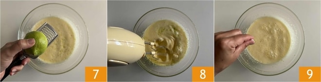 Continúa agregando la ralladura de un limón 7, sigue mezclando 8 y añade la pizca de sal 9.