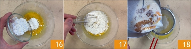 Añada también el almidón de maíz 16 y mezcle de nuevo para obtener una mezcla homogénea 17. Finalmente, vierta en el bol la leche ya caliente, filtrándola a través de un colador 18