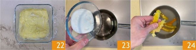 Una vez lista, enfríe inmediatamente la crema vertiéndola en un recipiente frío de congelador, luego transfiérala a una manga pastelera 22 y déjela enfriar en la nevera por 3 horas cubierta con film en contacto. Mientras tanto, puede encargarse del almíbar: en un cazo vierta el agua, el azúcar 23 y la cáscara de naranja y limón 24.