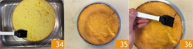 Humedezca la parte interna del segundo disco de bizcocho 34 y colóquelo sobre el relleno 35: de esta manera tendrá la parte cocida al contacto con el molde hacia arriba. Humedezca también la superficie con el almíbar 36.