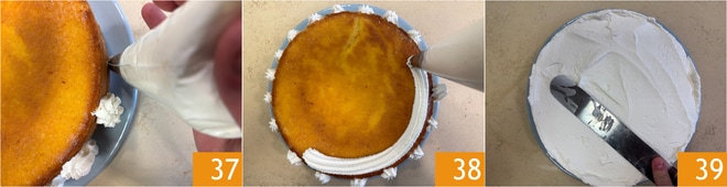 Ahora con la nata montada restante distribuya unos rosetones por todo el borde de la tarta 37 y cubra la superficie 38. Extienda con cuidado todo para obtener una cobertura lisa y ordenada 39.