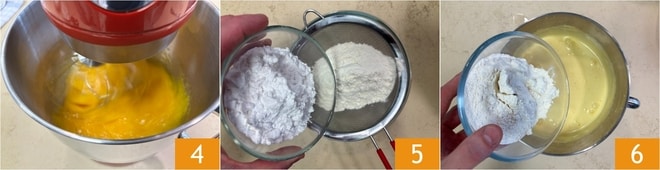 Accione las varillas y déjelas trabajar por al menos 10 minutos 4, hasta que la mezcla quede muy clara y espumosa. Mientras tanto tamice la harina y la fécula juntas 5 dos veces. Luego vierta los polvos poco a poco en la mezcla batida 6.