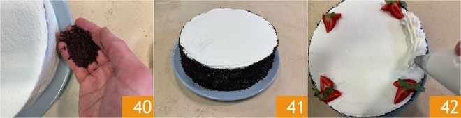 Con las manos, haga que se adhieran por todo el borde de la tarta los fideos de chocolate (40-41), distribuya las fresas y use la nata montada restante para decorar la superficie de la tarta de cumpleaños formando un festón 42.