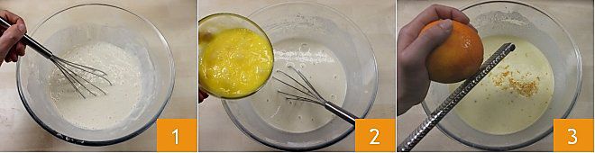 Para preparar la tarta de crepes dulces, comienza a preparar las crepes que serán la estructura de tu postre: coloca en un bol alto la harina previamente tamizada, el azúcar granulado, las semillas de media vaina de vainilla o un sobrecito de vainillina, 1 pizca de sal y la leche. Trabaja la mezcla con un batidor manual o con una batidora eléctrica hasta que quede lisa, suave y sin grumos 1. En otro bol aparte, bate los huevos con un tenedor, luego agrégalos a los otros ingredientes 2 y sigue mezclando. Derrite la mantequilla en un cazo a fuego lento y déjala templar, luego añádela a la masa para las crepes y mezcla cuidadosamente. Finalmente, añade a la masa la piel rallada de la naranja 3.