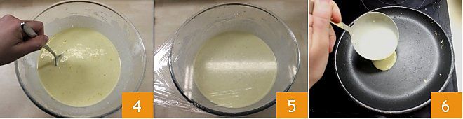 Mezcla bien los ingredientes para obtener una masa espesa sin grumos 4. Cubre la masa con film transparente y déjala reposar al menos media hora en la nevera 5. Pasado el tiempo de reposo necesario, retira la masa de la nevera y comienza a crear tus crepes: calienta una sartén para crepes o una sartén antiadherente de 20 cm de diámetro. Derrite una pequeña nuez de mantequilla y esparce por toda la superficie de la sartén con ayuda de papel de cocina. Vierte un cucharón de masa en el centro de la sartén 6.