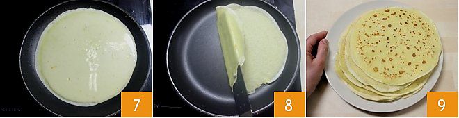 Ayudándote con el cucharón o una cuchara, extiende rápida y cuidadosamente la masa por toda la superficie de la sartén 7. Deja cocer por un minuto, levantando los bordes de la crepe de vez en cuando con una espátula para crepes o una espátula de madera para despegarla de la superficie; tan pronto como esté dorada, da la vuelta y espera a que tome el mismo color por el otro lado 8. Una vez lista, retírala de la sartén deslizándola sobre un plato, y continúa así para las restantes crepes, colocándolas una sobre otra a medida que estén listas 9. Cúbrelas con papel de cocina y resérvalas.