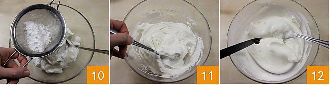 Ahora pasa a las cremas para el relleno. Para la crema de yogur: en un bol, coloca 500 g de yogur griego y añade el azúcar glas tamizado 10, mezcla para unir los ingredientes 11, luego abre la media vaina de vainilla y añade las semillas 12, luego mezcla la mezcla.