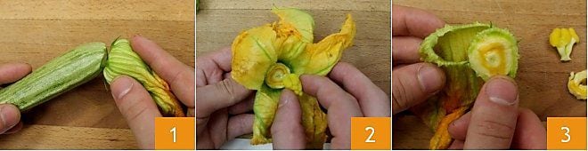 Para preparar la tarta de calabacines y sus flores, comenzad tomando las flores de calabacín: eliminad el tallo 1, el pistilo central 2 y cortad la parte final de la flor 3.