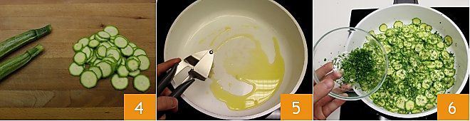 Cortad ahora los calabacines en rodajas 4. Colocad en una sartén bastante grande el aceite de oliva virgen extra, calentadlo un minuto y luego añadid el ajo machacado y dejad sofreír un par de minutos 5. Añadid ahora los calabacines y dejad cocinar durante 10 minutos a fuego lento, removiendo de vez en cuando. Tan pronto como los calabacines estén tiernos, espolvoreadlos con el perejil finamente picado y ajustad de sal y pimienta 6.