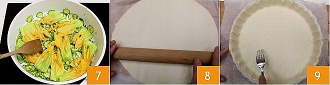 Añadid ahora las flores de calabacín 7, mezclad por unos segundos y apagad el fuego. Tomad el hojaldre y extiéndelo ligeramente con un rodillo 8. Colocad la masa en un molde previamente engrasado y perforadla con las púas de un tenedor 9.