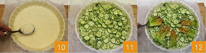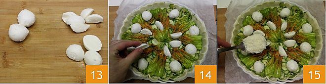 Espolvoread el hojaldre en el molde con 50 g de Grana Padano 10. Luego verted los calabacines 11 y las flores (que podéis disponer en forma de radios) 12.