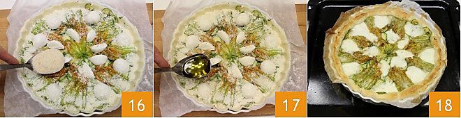 el pan rallado 16 y terminad rociando con un poco de aceite de oliva virgen extra 17. Hornead en horno precalentado a 180° durante unos 15-20 minutos (si es ventilado 160° durante 10-15 minutos), hasta que veáis la superficie de la tarta salada bien dorada. Vuestra tarta salada rellena de calabacines y sus flores está lista, dejadla enfriar un poco y servidla 18.