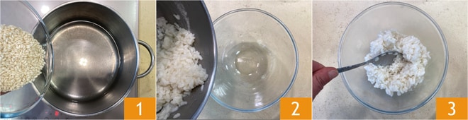 Para preparar la tarta dulce de arroz y ricotta, primero vierte en una olla el agua y el arroz 1, enciende el fuego y cocina durante unos 25 minutos, hasta que haya absorbido todo el líquido. Una vez cocido, transfiere el arroz a un bol 2 y deja enfriar completamente 3.