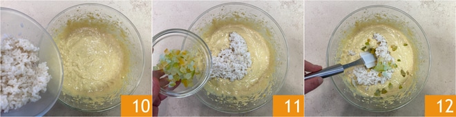Finalmente añade el arroz 10 y las frutas confitadas 11 y mezcla para incorporarlos de manera uniforme 12.