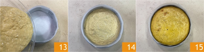 Vierte la mezcla en un molde desmontable de 22 cm de diámetro forrado con papel de horno 13, asegurándote de que el papel sobresalga del molde en altura porque la tarta tenderá a crecer durante la cocción. Nivelar la superficie 14 y hornear en horno estático a 170° durante unos 80 minutos 15.